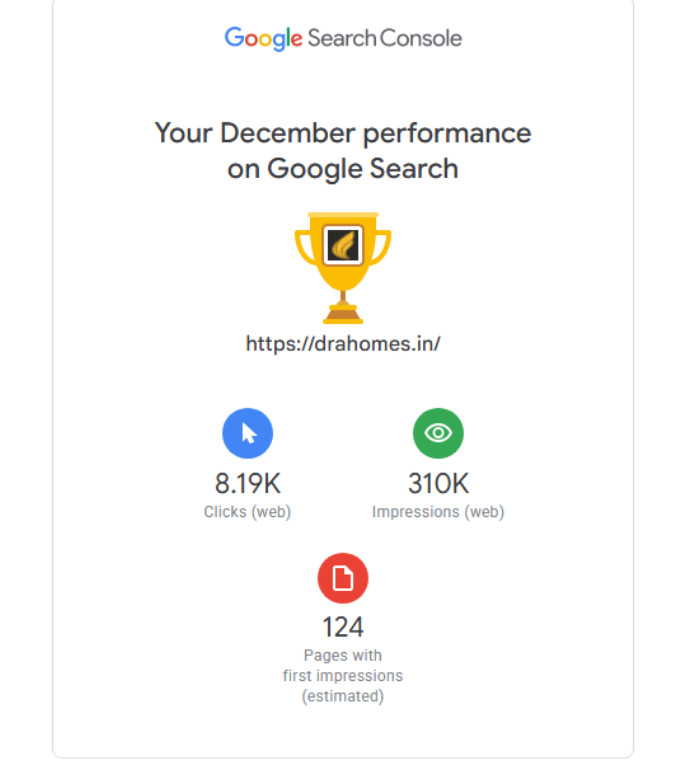 Over 8.19K people discovered DRA Homes on Google in December 2025. Let us help you find your dream home too!. In fact our visitor count is increasing steadily. For your reference, we have displayed an authentic report generated from Google Search Console.